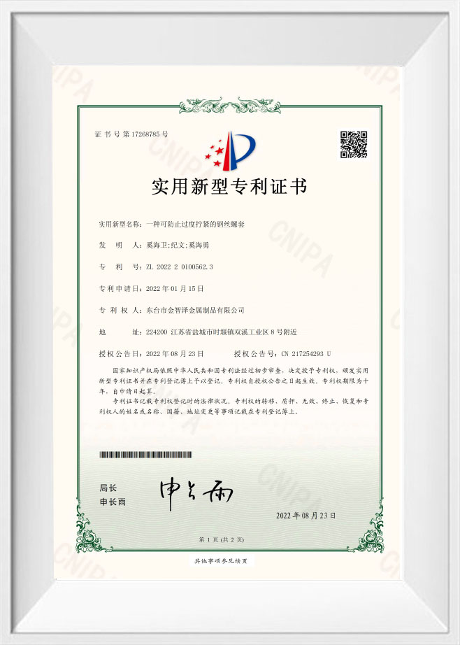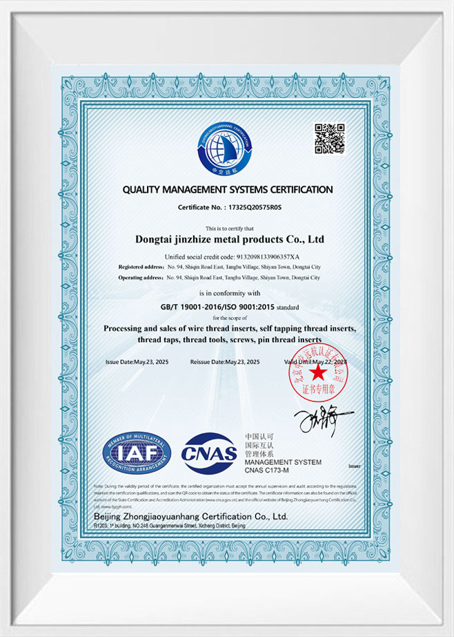 Dongtai Jinzhize Metal Products Co., Ltd. is a specialized manufacturing facility dedicated to threaded connection products for the automotive and aerospace sectors. We primarily produce Helical Wire Inserts, Self-Tapping Inserts, Key Locking Inserts, Threaded Adapters, Oil Plugs, as well as matching installation taps and tools.
